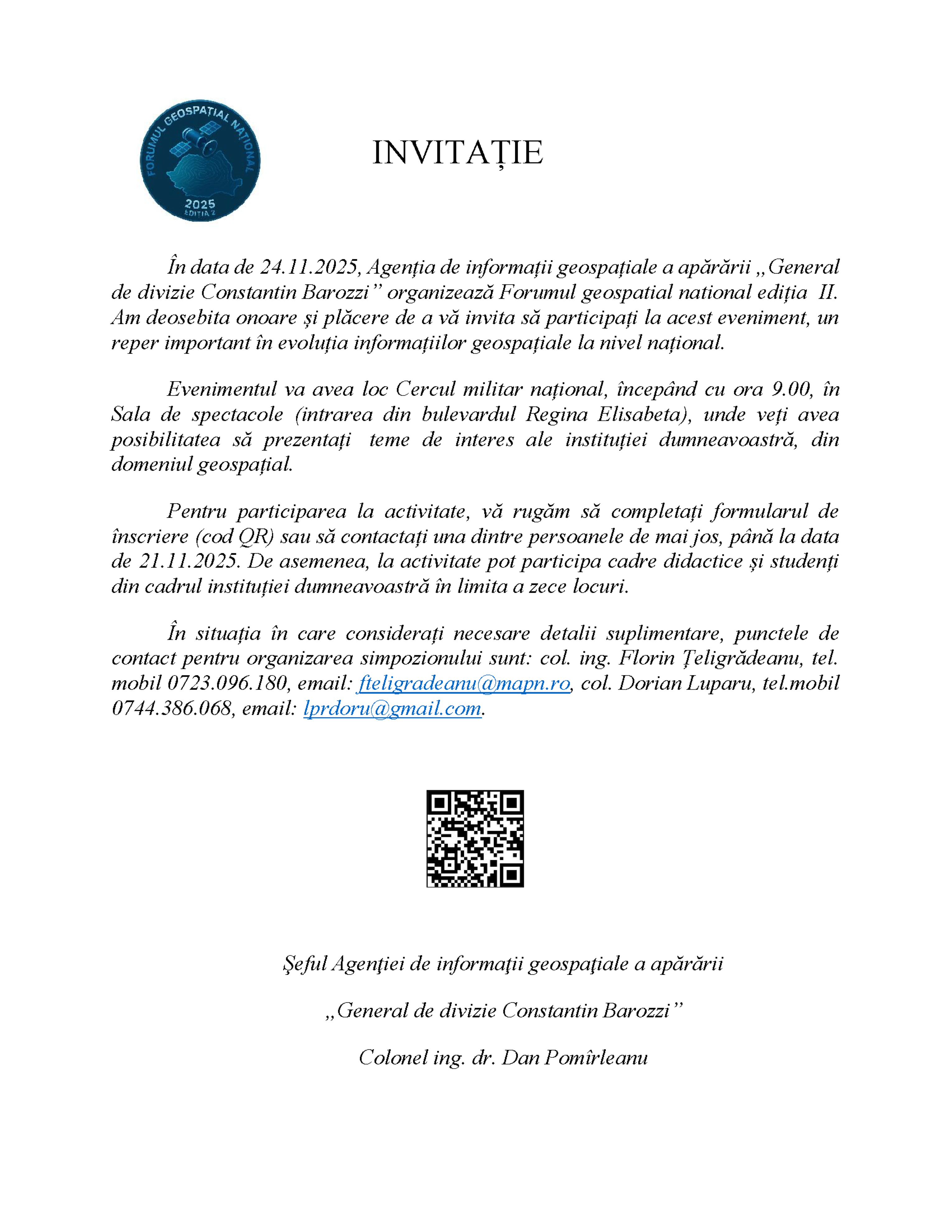 Agenția de informații geospațiale a apărării „General de divizie Constantin Barozzi” organizează, în data de 24.11.2025, Forumul geospatial national ediția II.