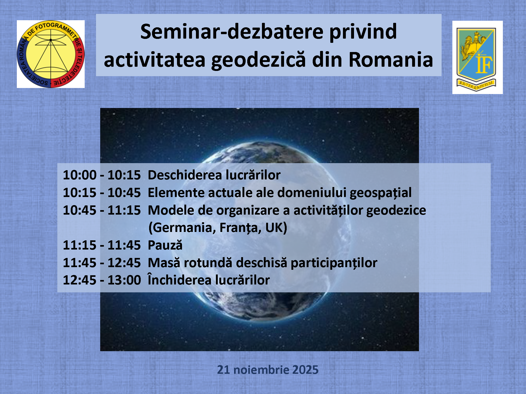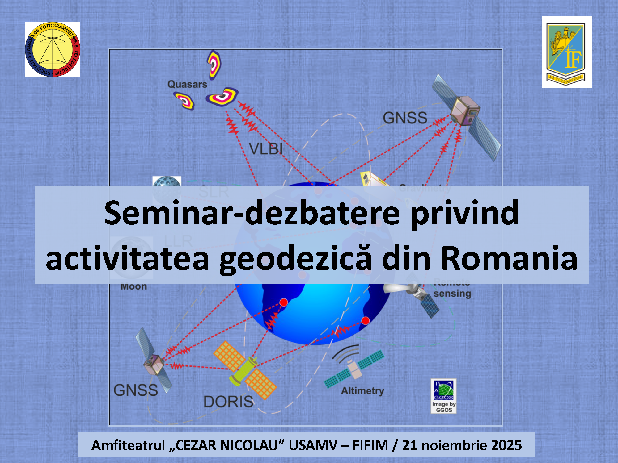 Vineri, 21 noiembrie 2025, Societatea Română de Fotogrammetrie si Teledetecție (SRFT), cu sprijinul Facultății de Îmbunătățiri Funciare și Ingineria Mediului (FIFIM) din cadrul Universității de Științe Agronomice și Medicină Veterinară din București (USAMVB), organizează un seminar-dezbatere privind activitatea geodezică din România.