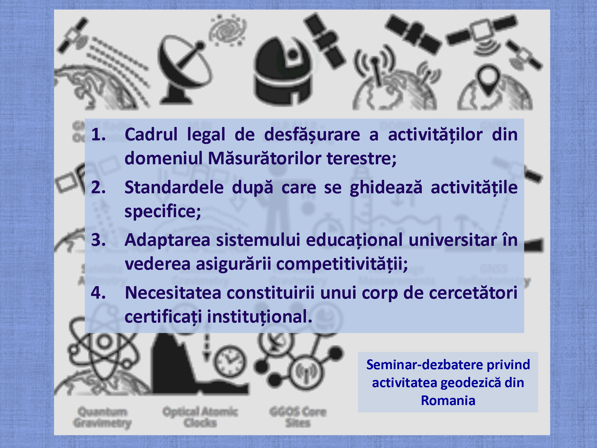 În cadrul seminarului vor fi dezbătute mai multe subiecte importante privind activitatea geodezică din țara noastră.