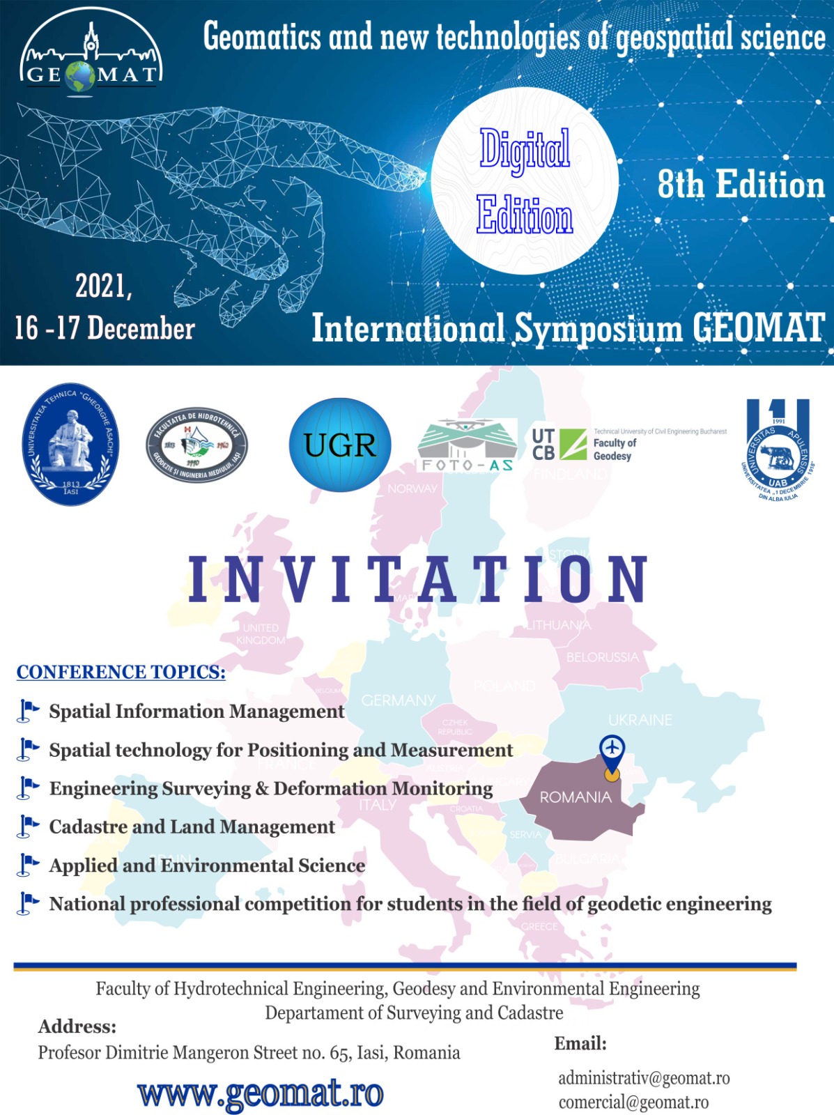 Cea de-a opta ediție a Simpozionului Internaționa GEOMAT, organizat de către Facultatea de Hidrotehnică, Geodezie și Ingineria Mediului din cadrul Universității ”Gheorghe Asachi” Iași, va avea loc în format digital, în perioada 16-17 decembrie 2021.