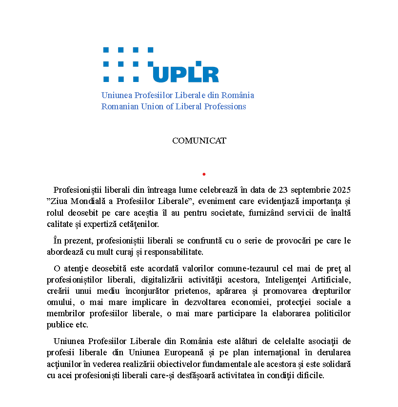 Uniunea Profesiilor Liberale din România (UPLR), membru cu drepturi depline al Uniunii Mondiale a Profesiilor Liberale (UMPL) din anul 2006, marchează acest eveniment prin difuzarea următorului Comunicatul de presă.